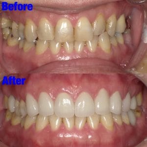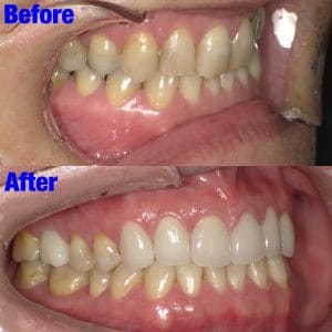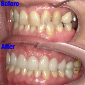 Before写真の上顎中央にあるような、大きく向きを変えなければならない歯がある場合、歯の神経を取る必要がある場合がある